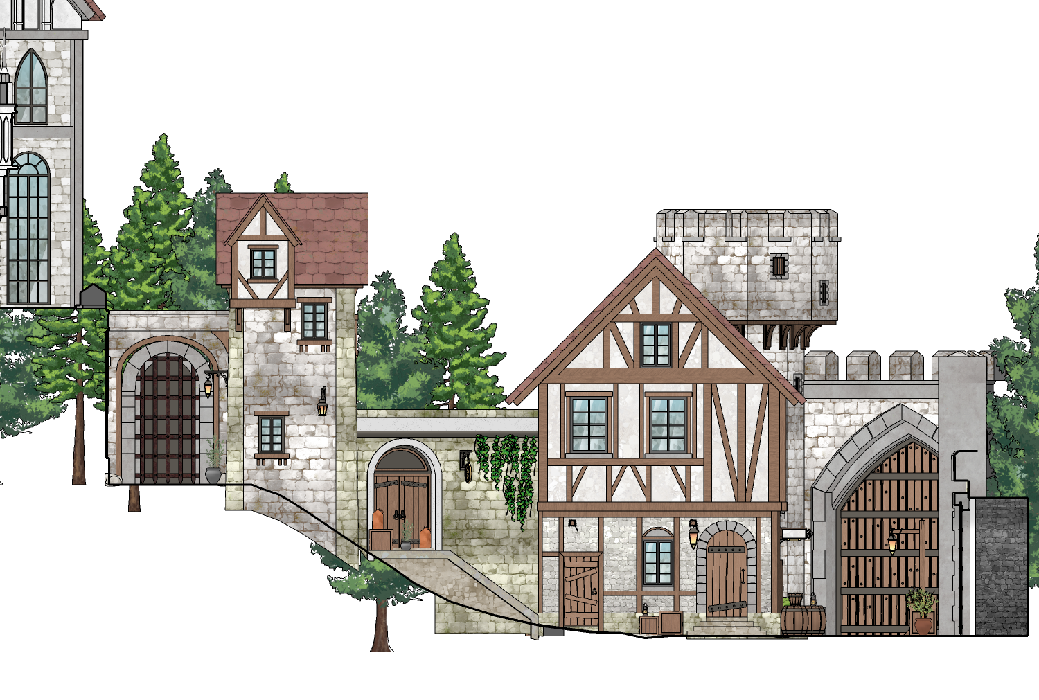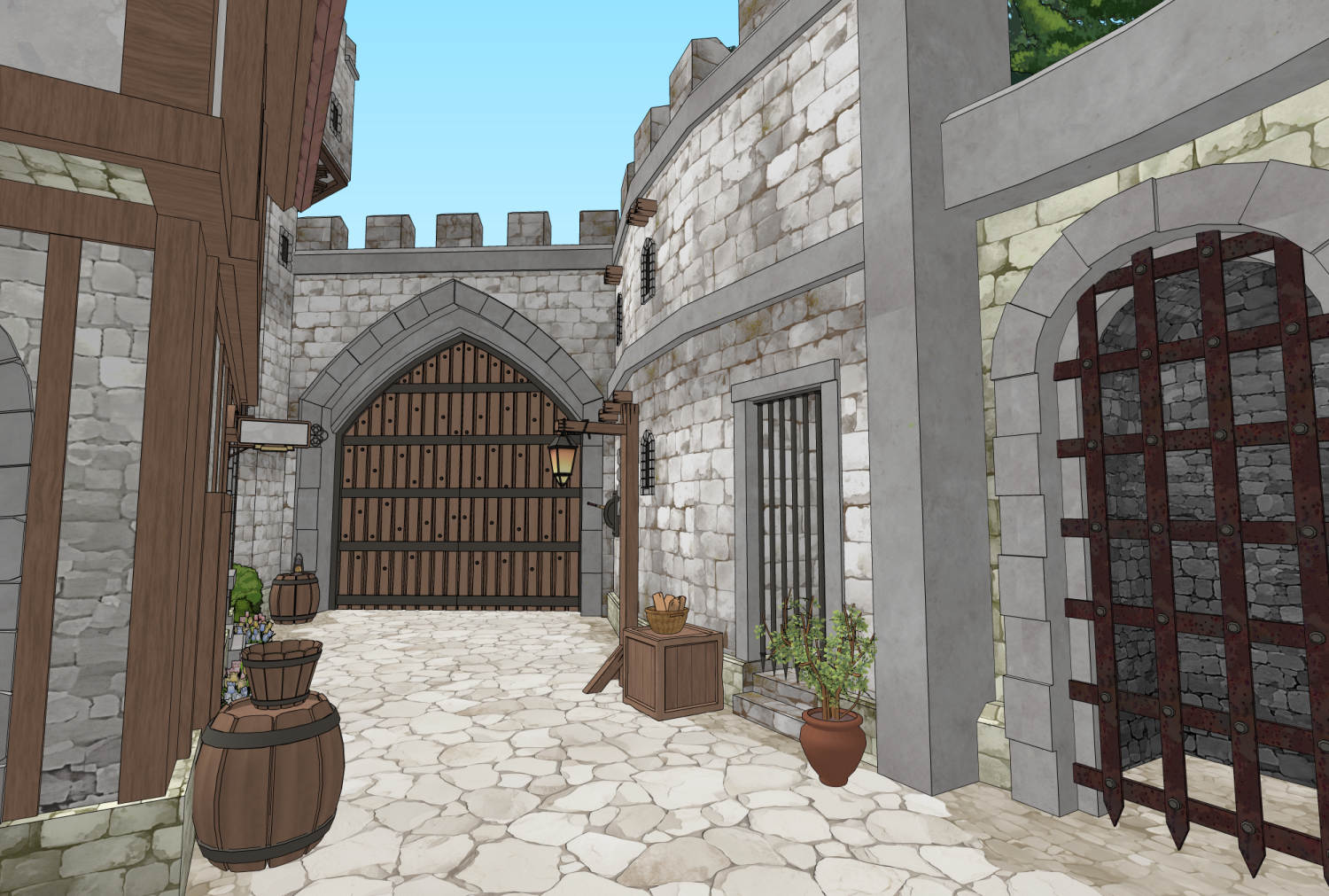 성문과 멀리보이는 성, 오르막길, 다른 장소로 이동할 수 있는 통로길 등 다양한 연출이 가능하도록 구조를 제작했습니다.