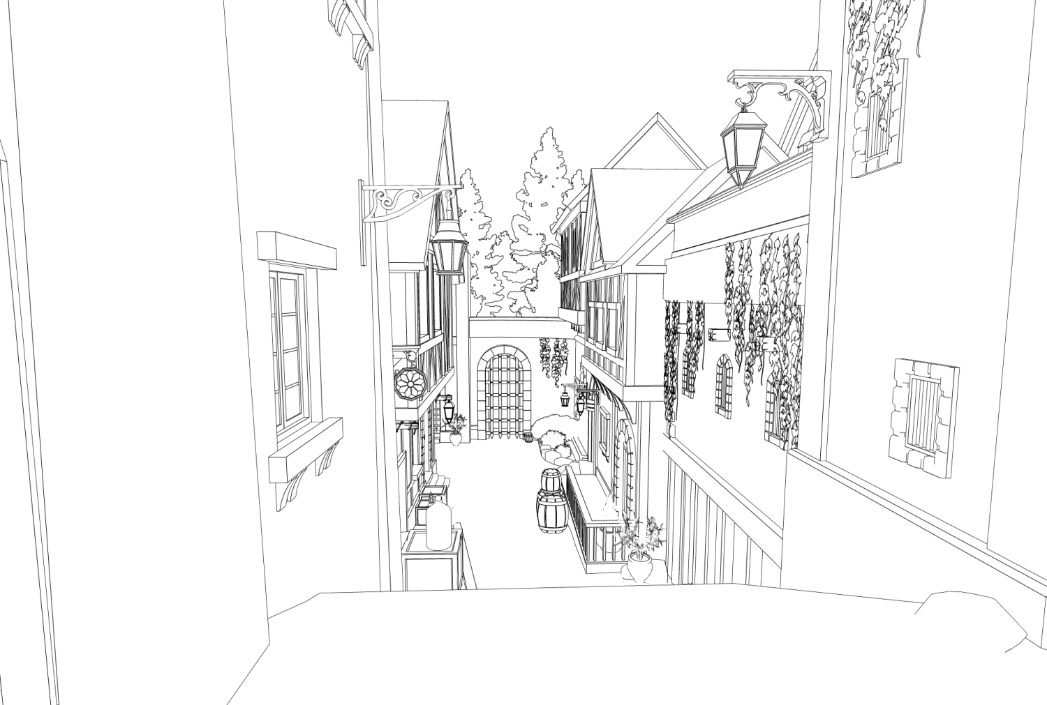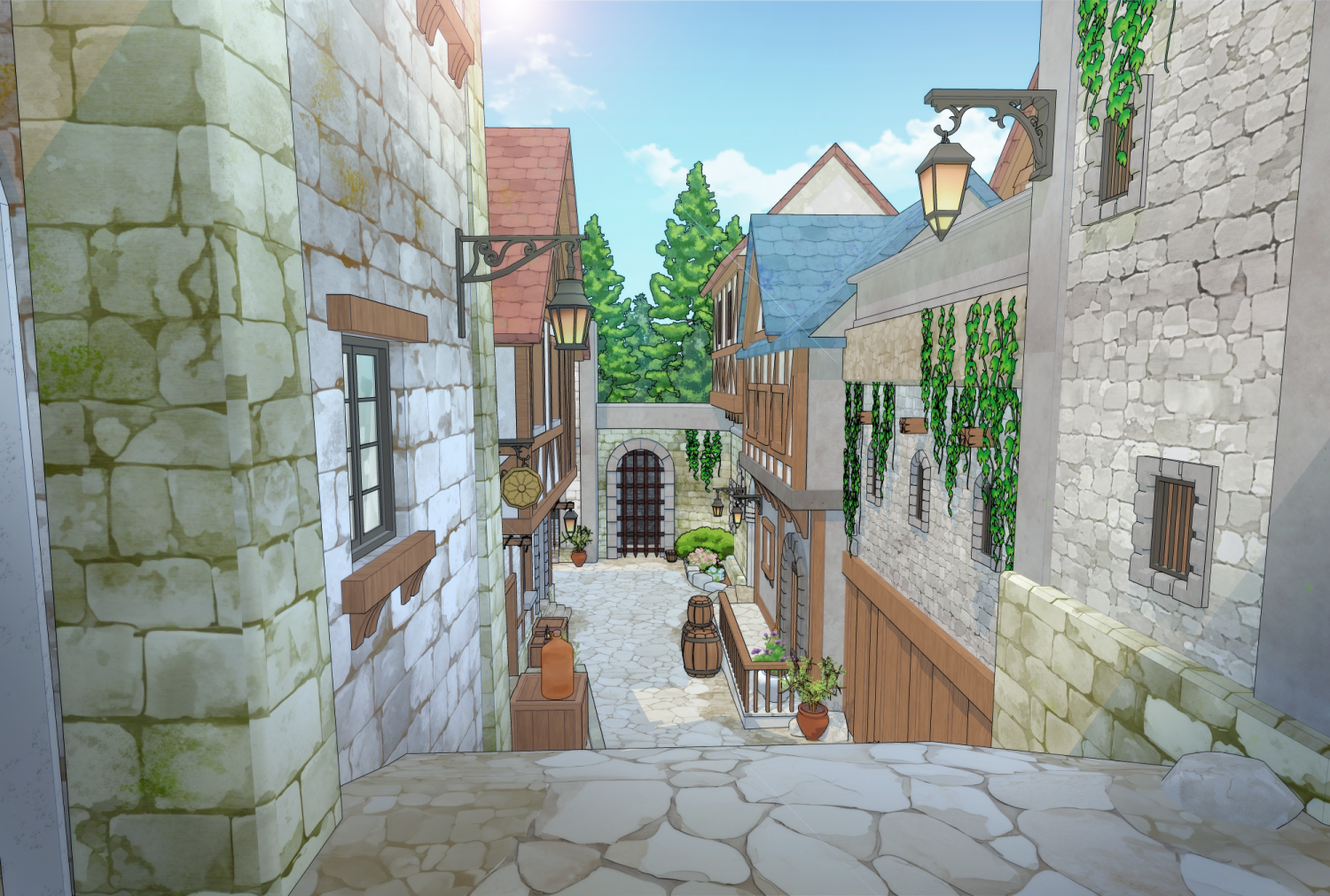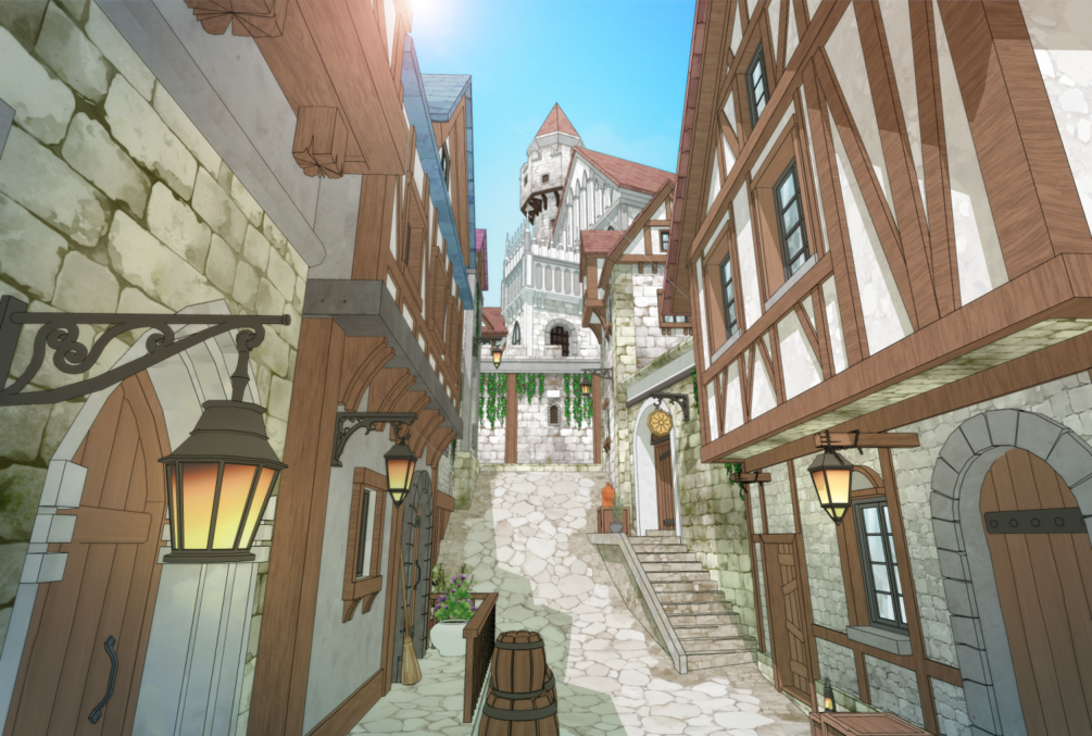 판타지 장르에서 골목 연출 시 다양한 구도로 연출하기에 적합합니다.