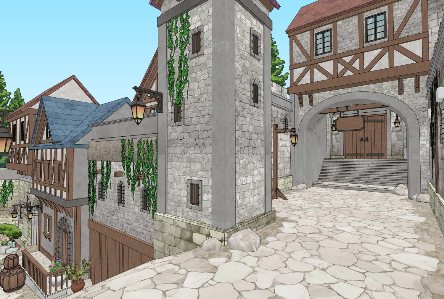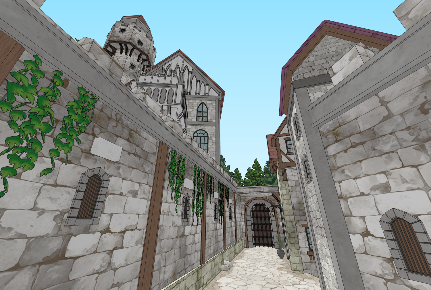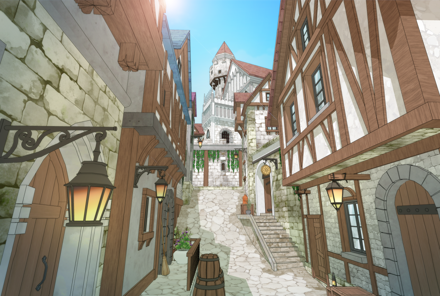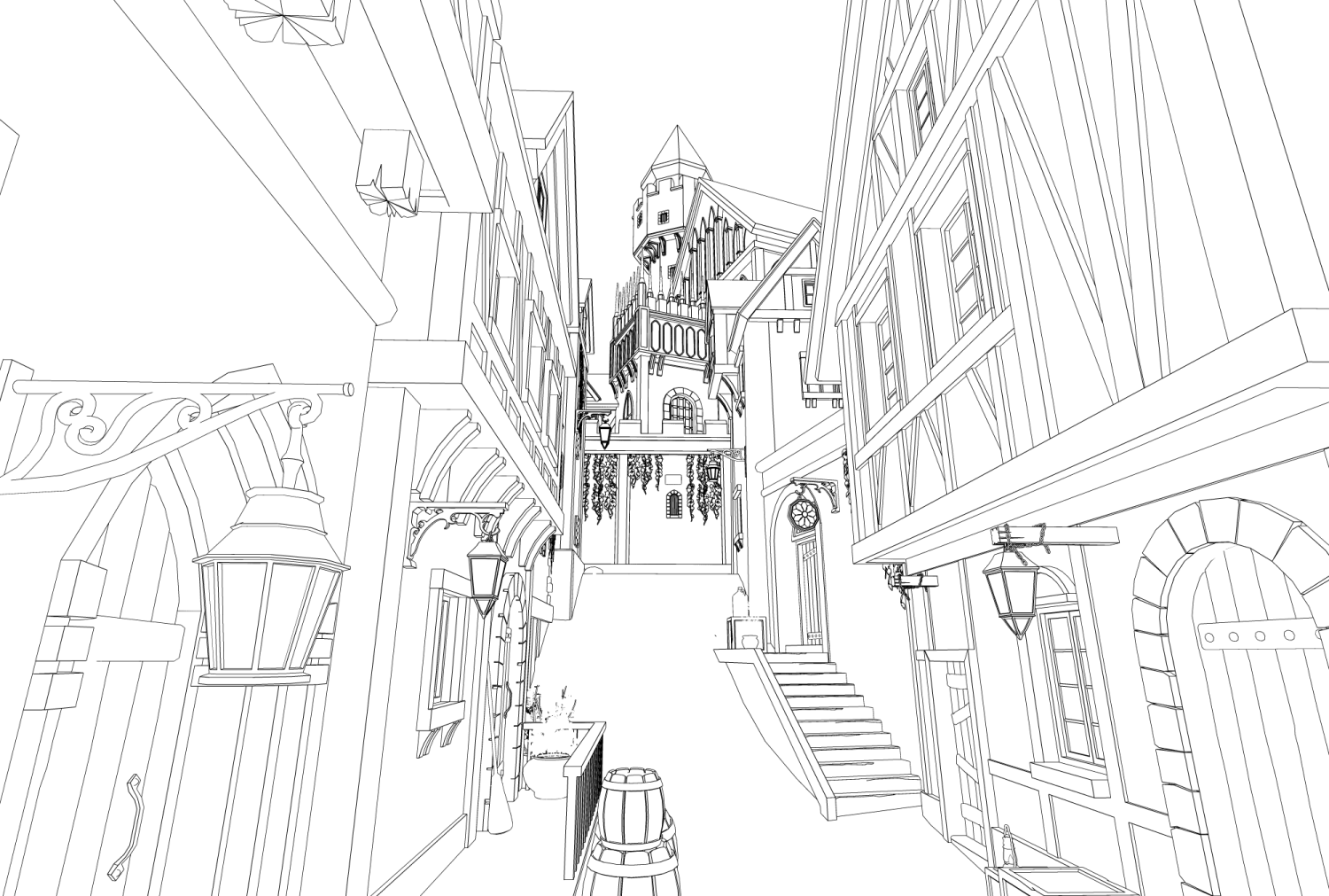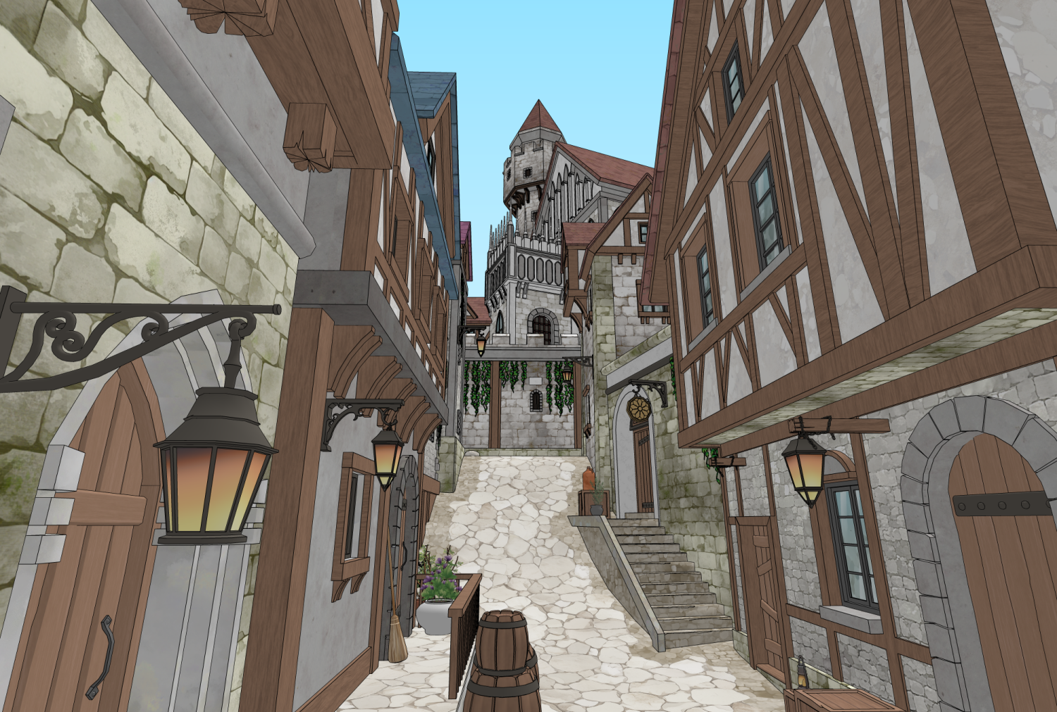 성과 오르막길 통로길이 어우러진 다각도 연출이 가능한 3D 판타지 골목 배경입니다.