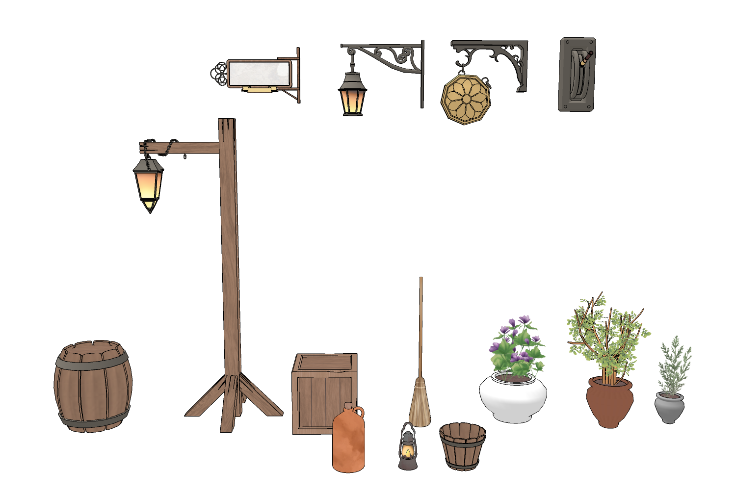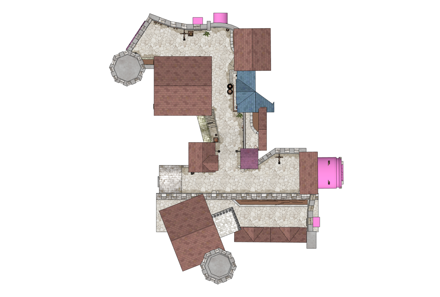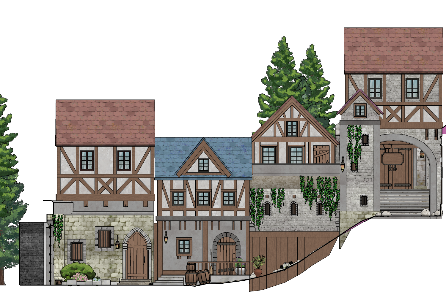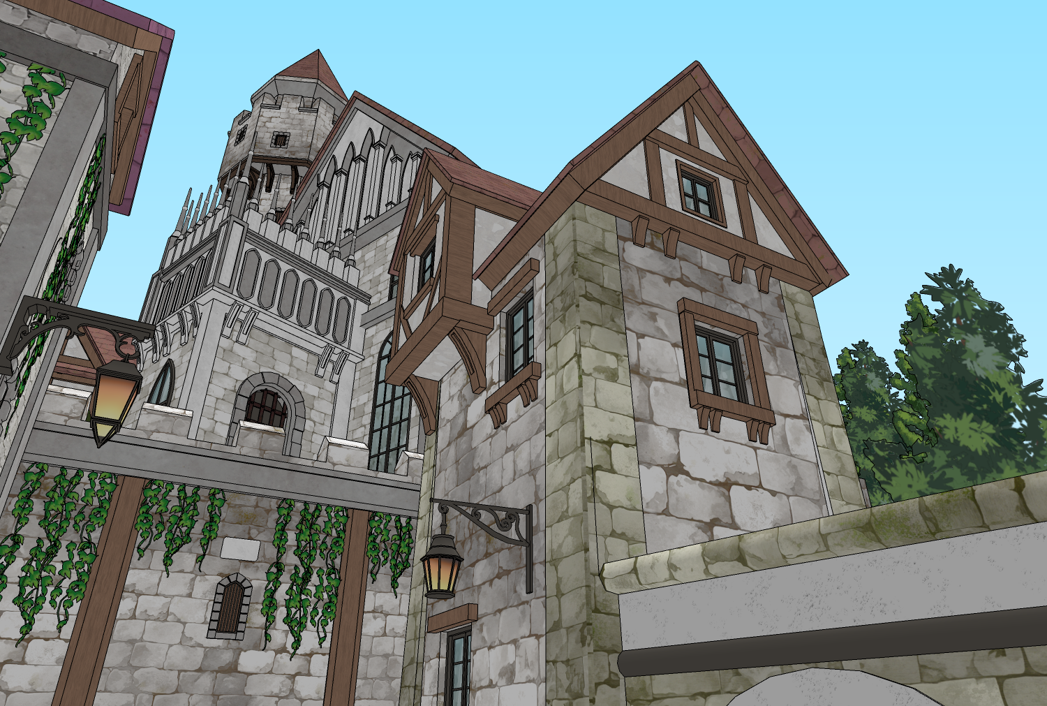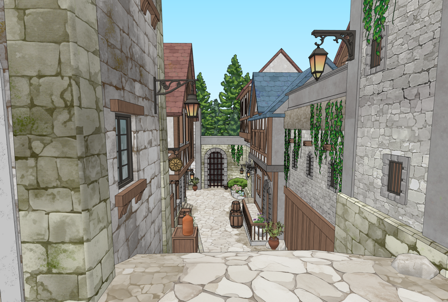 성과 오르막길 통로길이 어우러진 다각도 연출이 가능한 3D 판타지 골목 배경입니다.